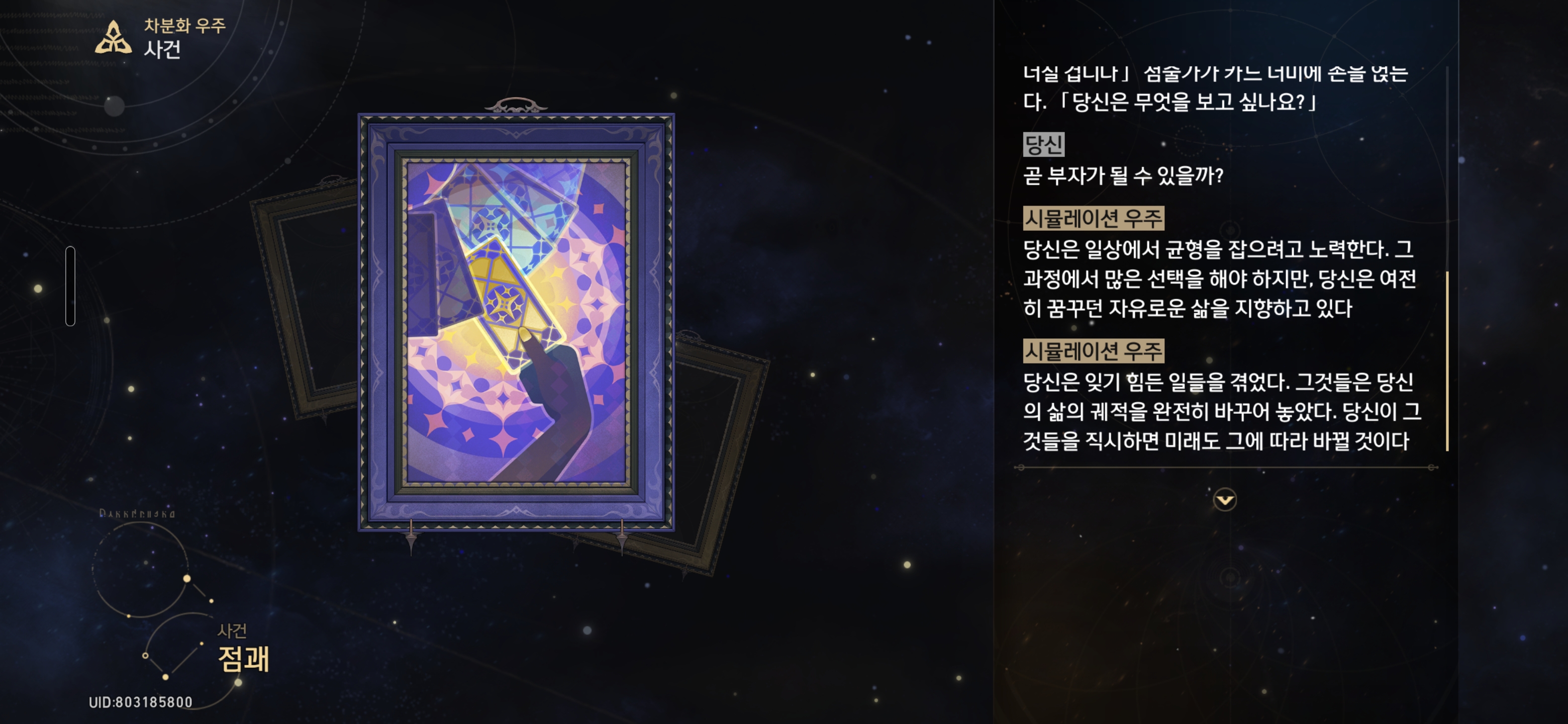 그녀는 별하늘처럼 깊은 긴 소매 속에서 타워트 카드를 꺼내 능숙하게 몇 묶음으로 나눠 당신 앞에 늘어 놓는다