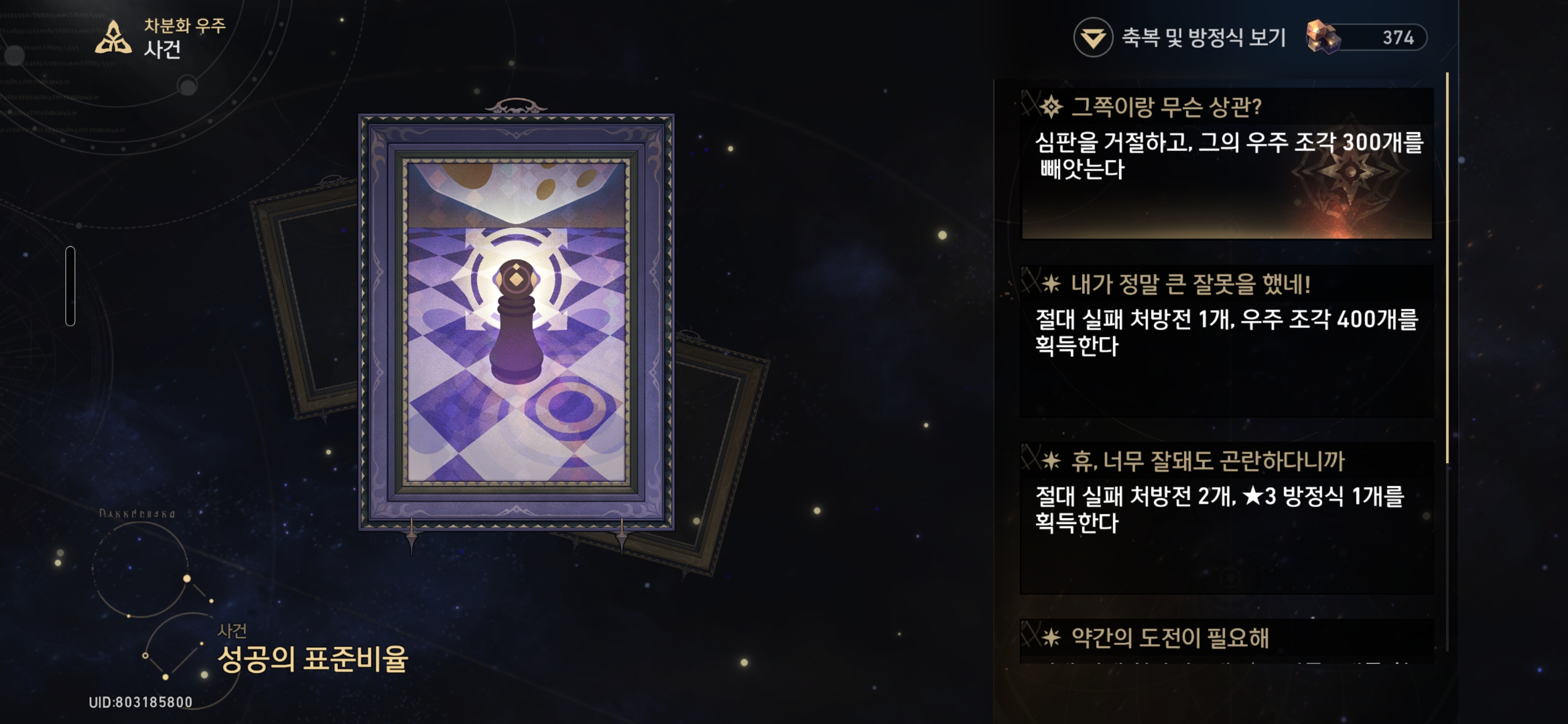 내가 정말 큰 잘못을 했네! - 절대 실패 처방전1개, 우주 조각 400개를 획득한다