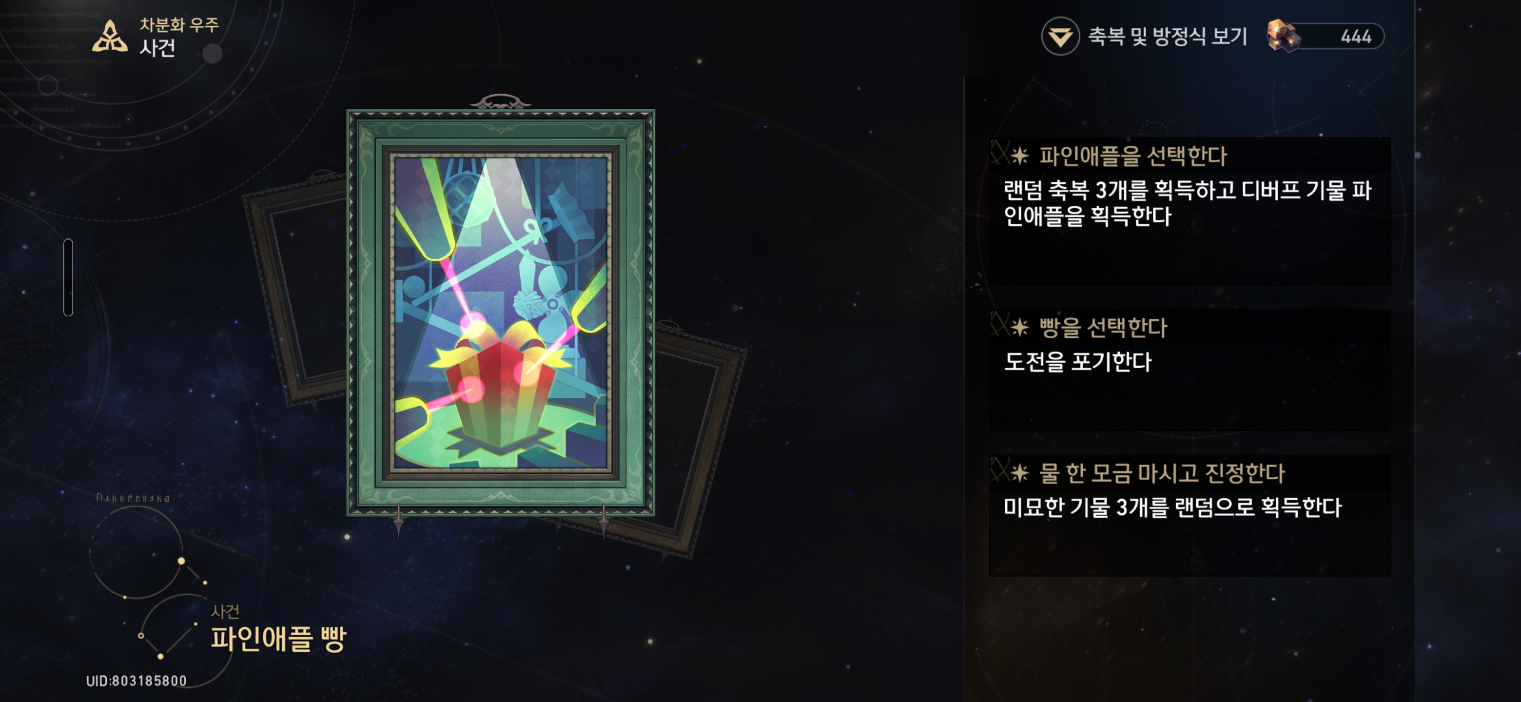 파인애플을 선택한다 - 랜덤 축복 3개를 획득하고 디버프 기물 파인애플을 획득한다