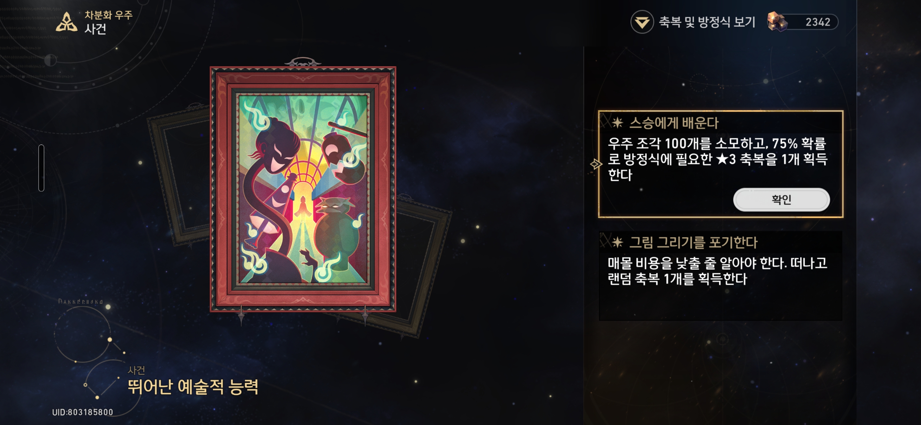 붓을 한 번 휘두른다 - 우주 조각 25개를 소모하고, 25% 확률로 방정식에 필요한 ★3 축복을 1개 획득한다