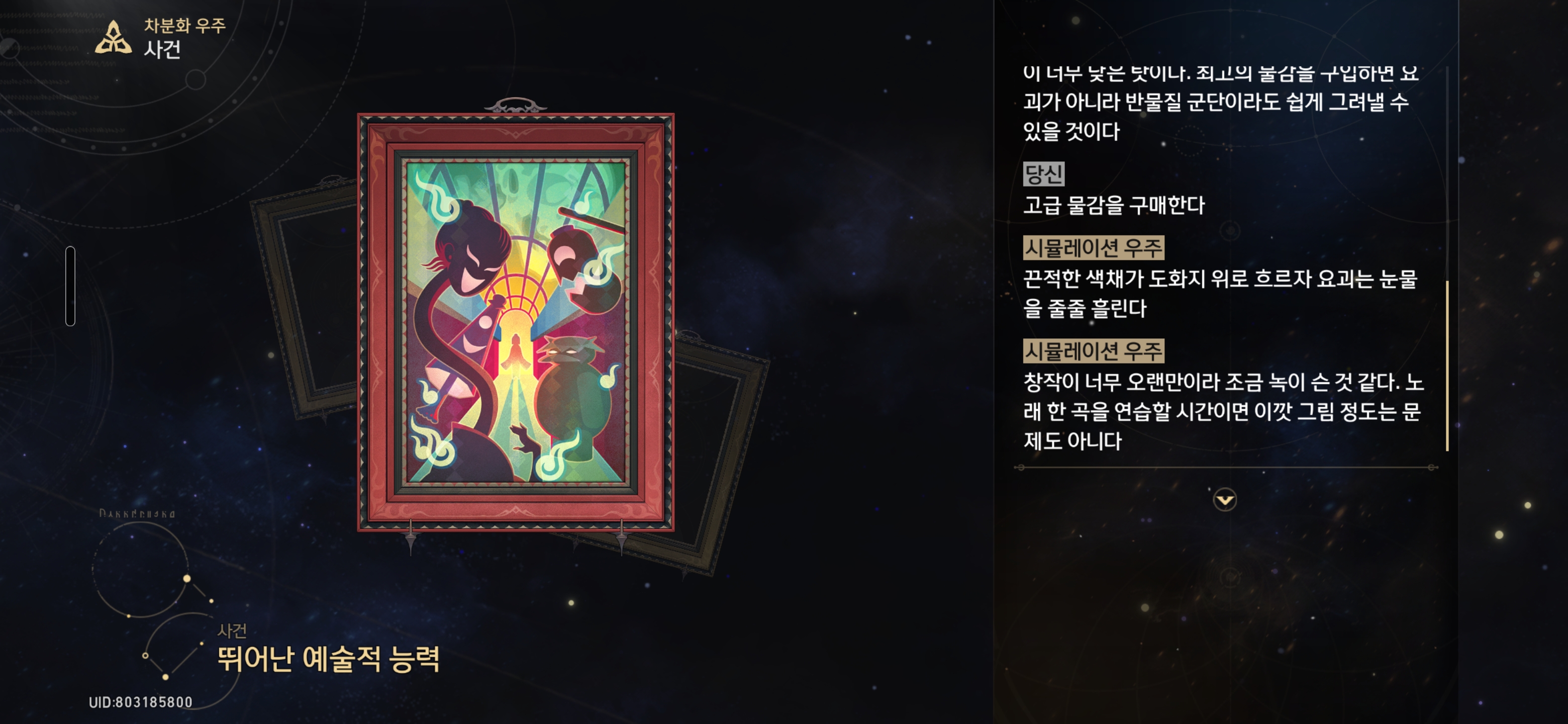 고급 물감을 구매한다 - 우주 조각 50개를 소모하고, 50% 확률로 방정식에 필요한 ★3 축복을 1개 획득한다