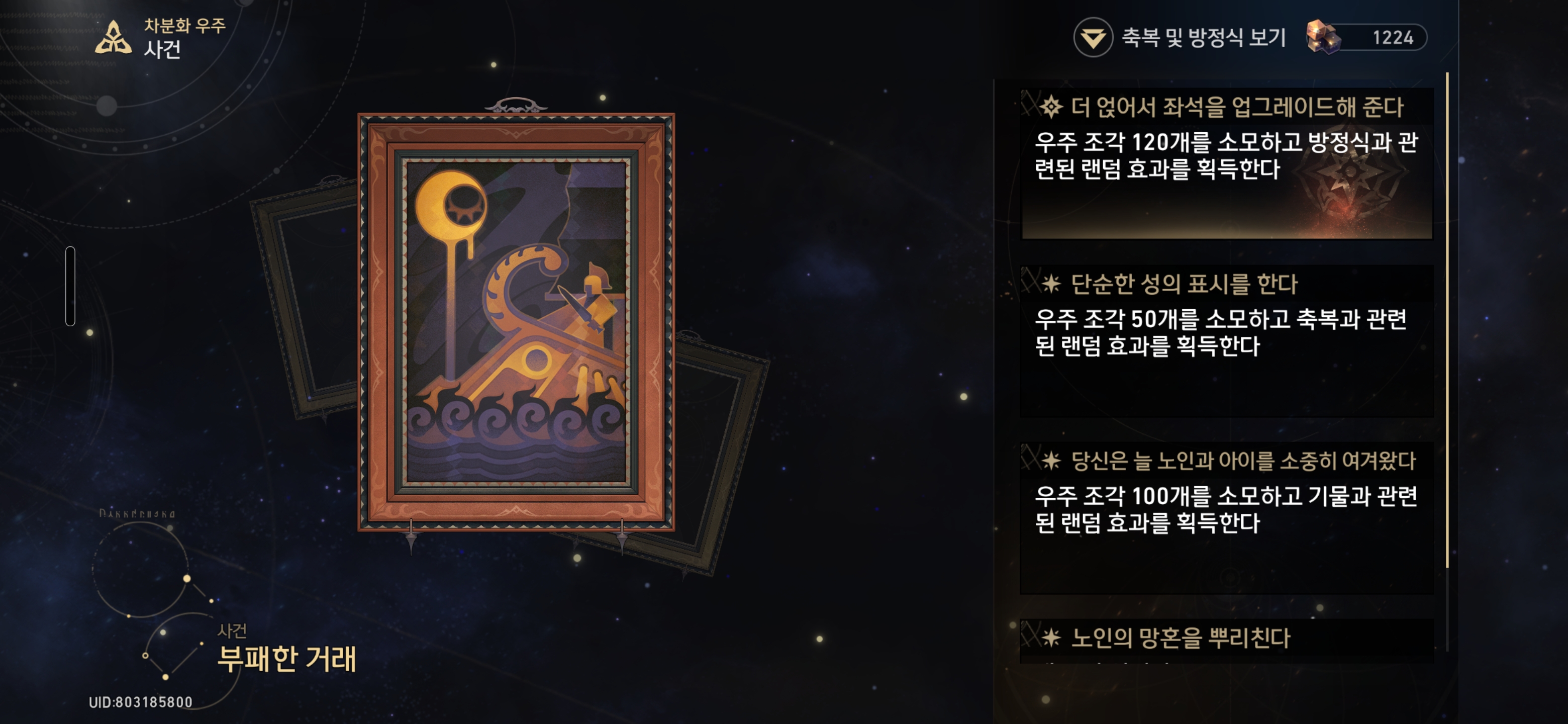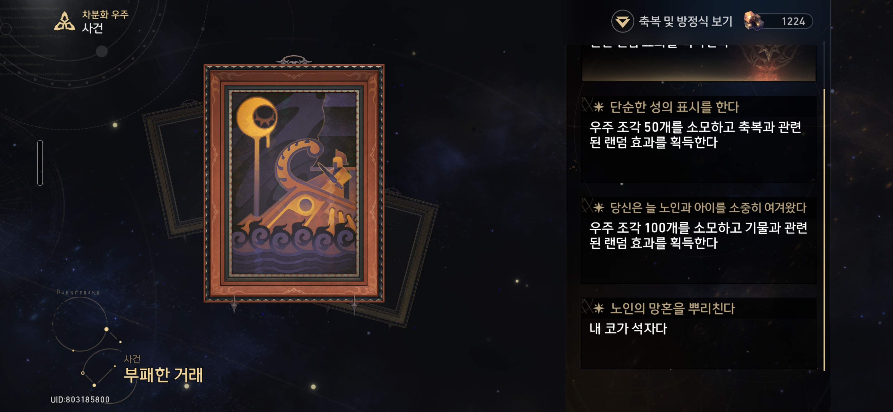 단순한 성의 표시를 한다 - 우주 조각 50개를 소모하고 축복과 관련된 랜덤 효과를 획득한다
