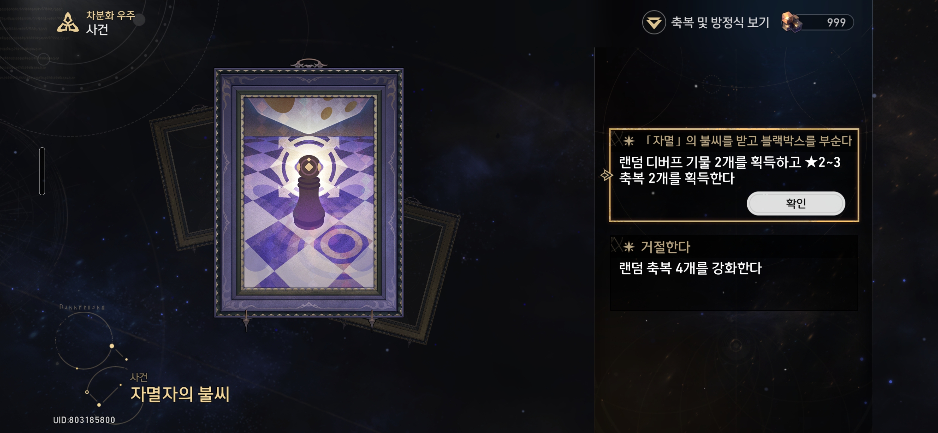 「자멸」의 불씨를 받고 블랙박스를 부순다 - 랜덤 디버프 기물 2개를 획득하고 ★2~3 축복 2개를 획득한다