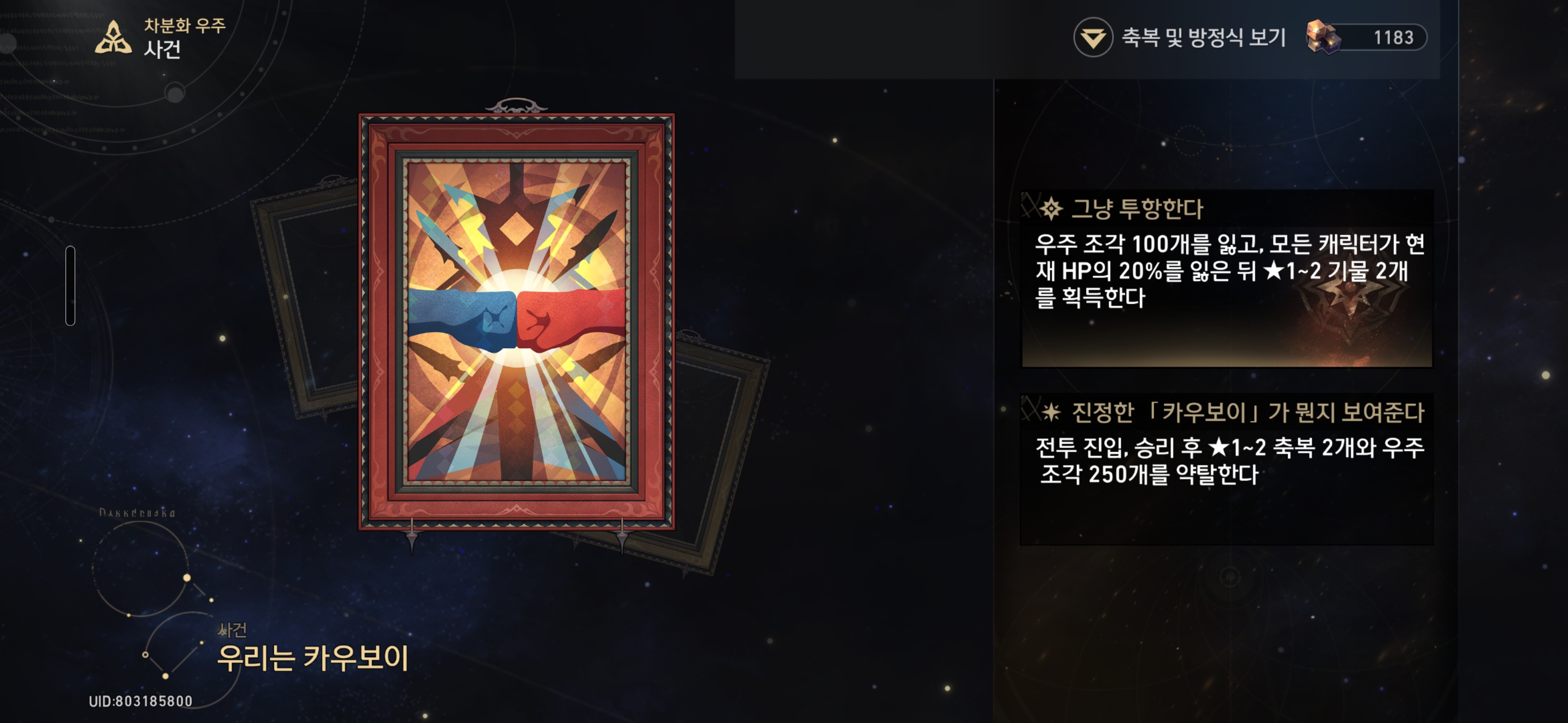 진정한 「카우보이」가 뭔지 보여준다 - 전투 진입, 승리 후 ★1~2 축복 2개와 우주 조각 250개를 약탈한다
