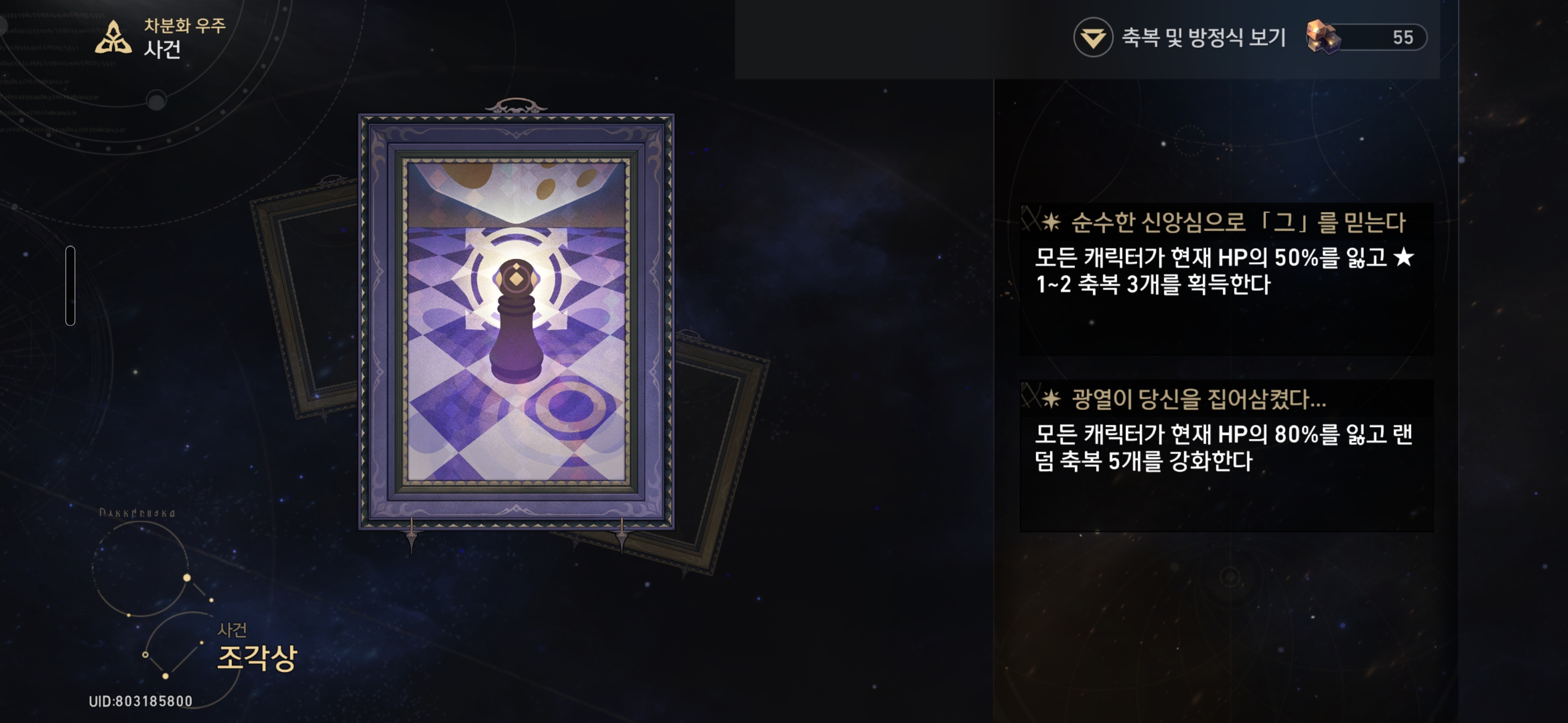 순수한 신앙심으로 「그」를 믿는다 - 모든 캐릭터가 현재HP의 50%를 잃고 ★ 1~2축복 3개를 획득한다