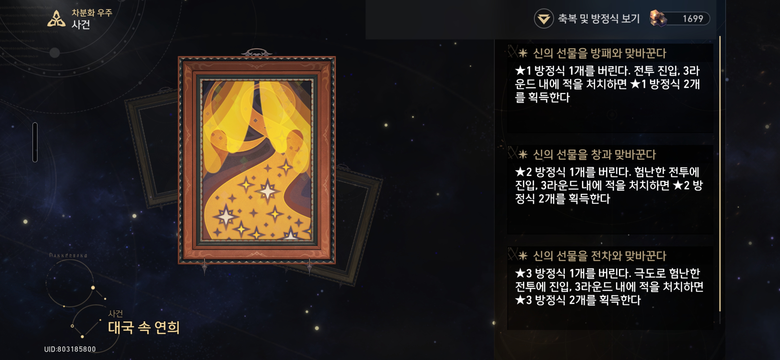 ★1 방정식 1개를 버린다. 전투진입, 3라운드 내에 적을 처치하면 ★1 방정식 2개를 획득한다