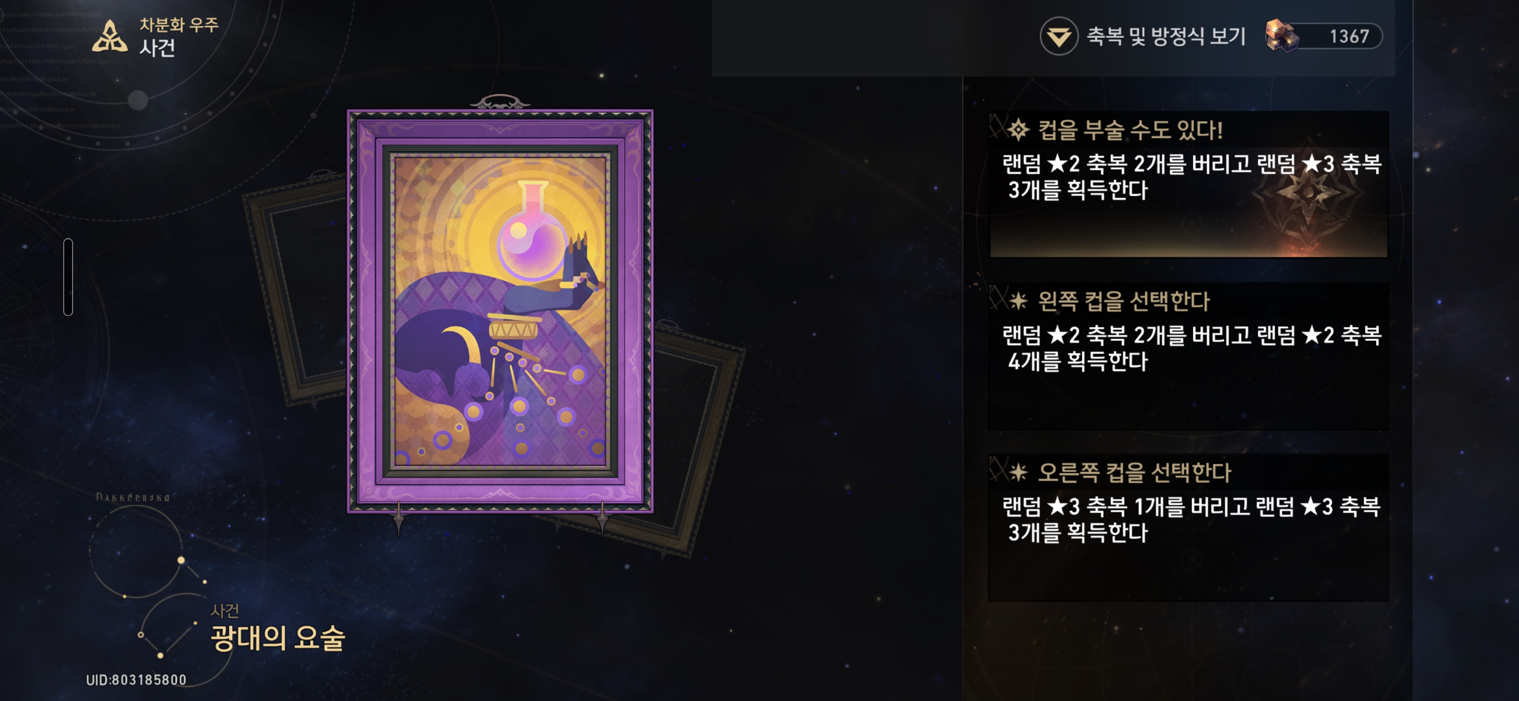 오른쪽 컵을 선택한다 - 랜덤 ★3 축복 1개를 버리고 랜덤 ★3 축복 3개를 획득한다