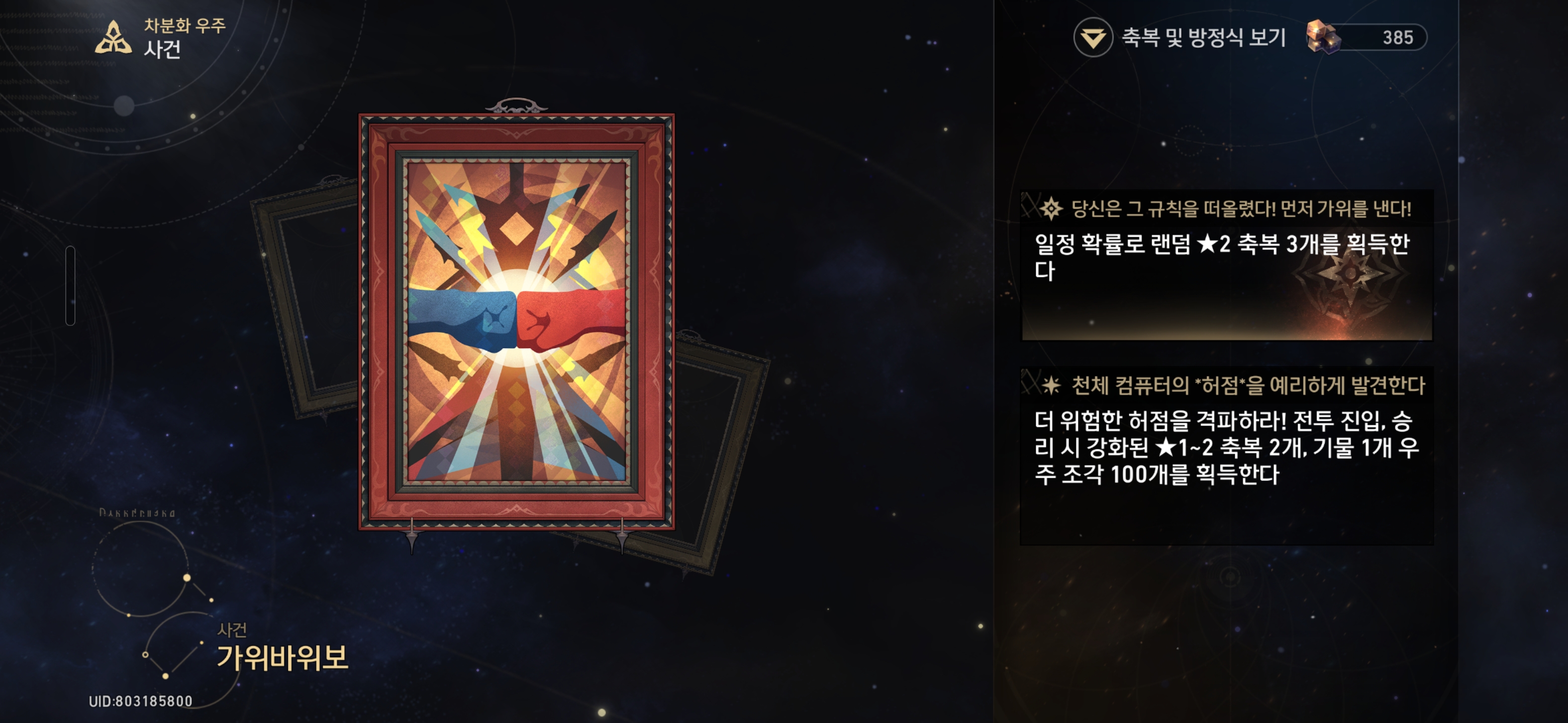당신은 그 규칙을 떠올렸다! 먼저 가위를 낸다! - 일정 확률로 랜덤★2축복 3개를 획득한다 (조건부)