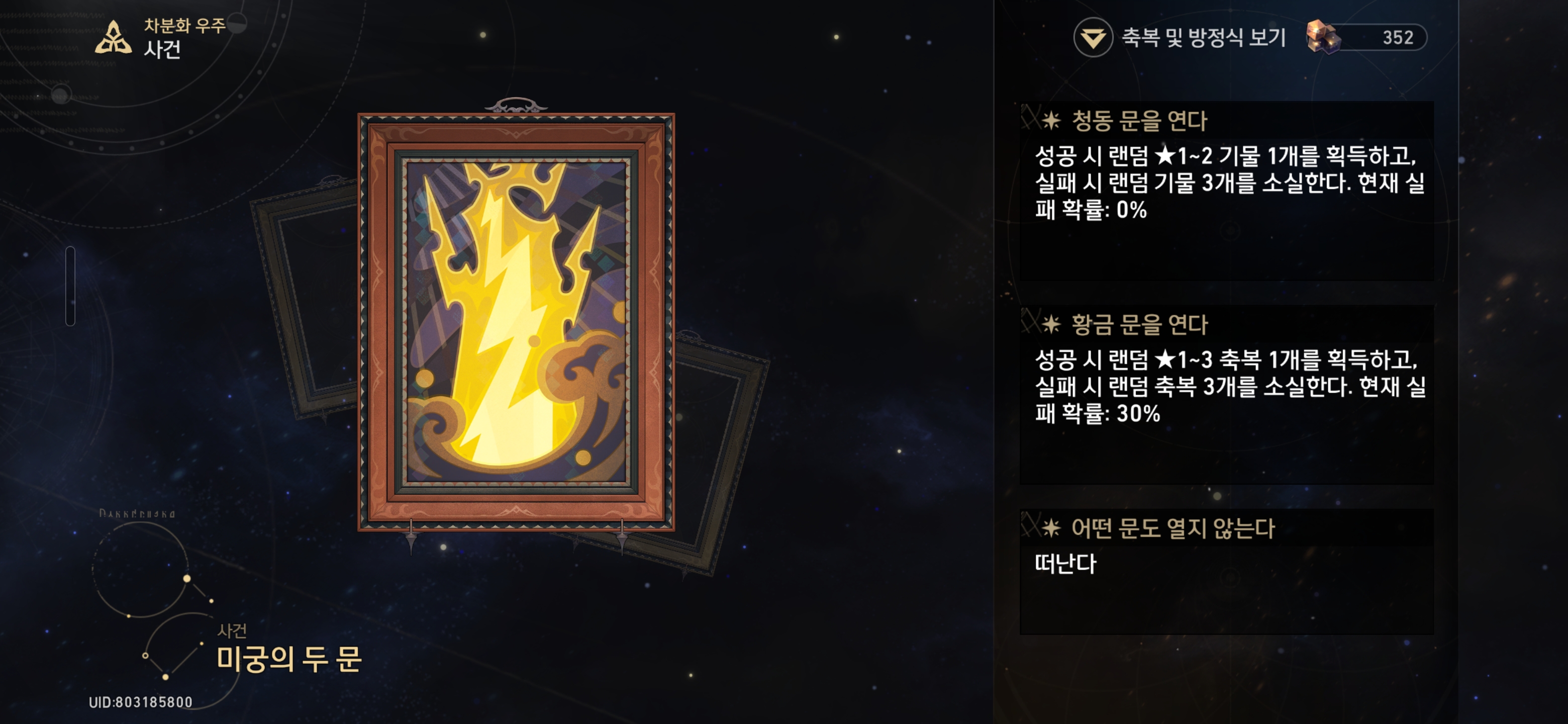 ▶황금 문을 연다 - 성공시 랜덤 ★1~3 축복 1개를 획득하고, 실패시 랜덤 축복 3개를 소실한다.