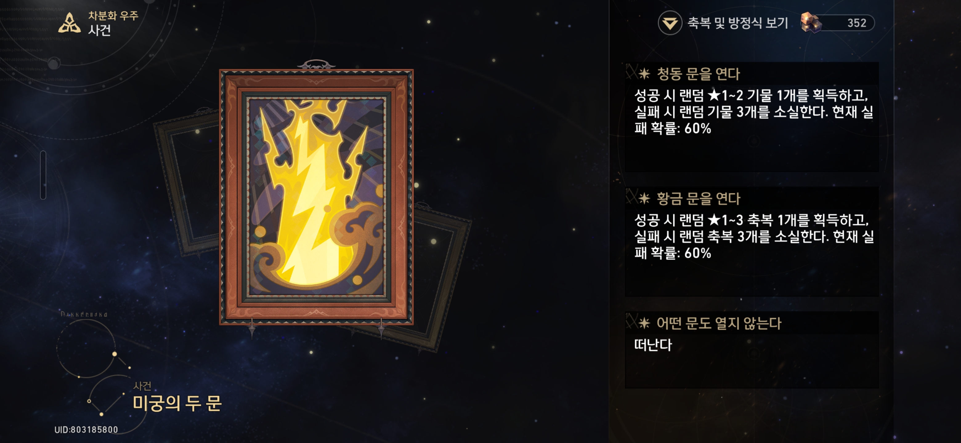 황금 문을 연다 - 성공시 랜덤 ★1~3 축복 1개를 획득하고, 실패시 랜덤 축복 3개를 소실한다.
