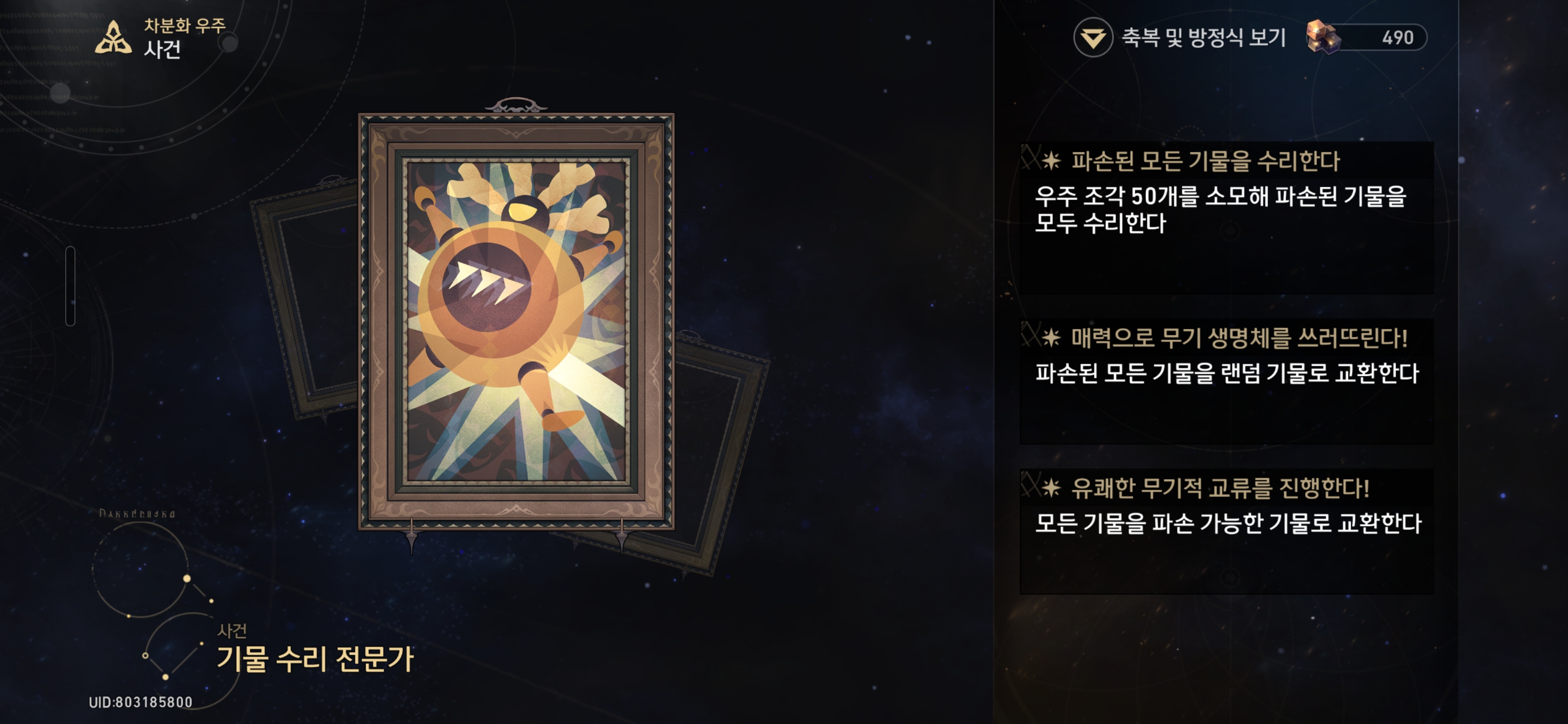 파손된 모든 기물을 수리한다 - 우주 조각 50개를 소모해 파손된 기물을 모두 수리한다